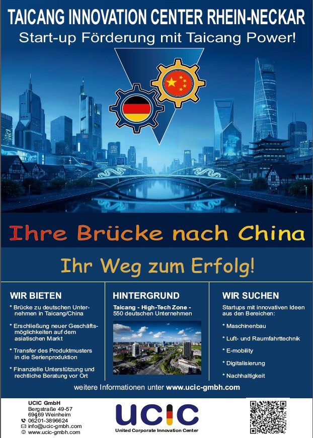 Die UCIC GmbH stellt in Zusammenarbeit mit dem Taicang Innovationcenter Rhein-Neckar fundierte Unterstützung für Start-ups und innovative Unternehmen bereit. Ziel ist es, innovative Ideen in Kooperation mit deutschen Firmen in Taicang erfolgreich auf dem chinesischen Markt umzusetzen.